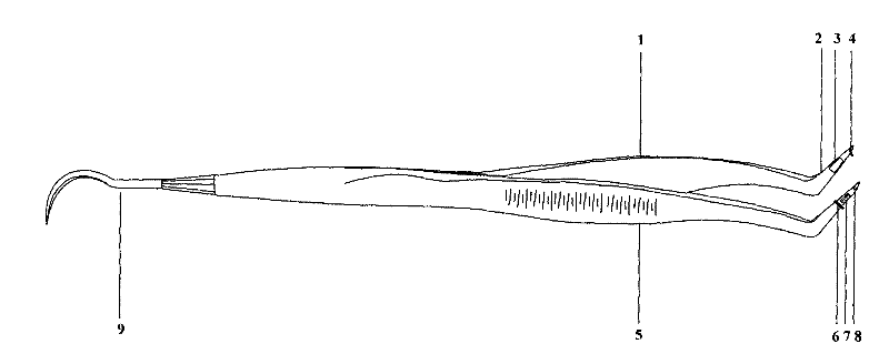 本实用新型公开了一种可调式托槽定位镊。针对现在技术产品拾取托槽时很容易滑落,粘接托槽时托槽高度难以达到完全精确,既影响正畸效果又易引发医生视疲劳等缺陷,本实用新型提出的可调式托槽定位镊通过在夹拾端(2)固定一根夹持档(4)和配套的夹持孔(8),使定位镊能稳固地拾取托槽。定位镊在夹拾端(2)标示刻度尺(7)并配合可滑动的定位档(6),能够实现临床操作中对托槽粘接要求的各个高度的精确定位。定位镊尾端带有一个口腔探针(9),避免医生在粘接过程中反复交替使用镊子、探针带来的不便。与现有技术相比,本实用新型产品对托槽定位准确,结构简单,制作工艺和成本低,医生使用方便。