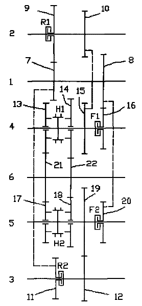 提供一种适用于工程机械的变速器,它由一根输入轴(1),一根输出轴(6),四根中间轴(2、3、4、5),四个多片式摩擦离合器(F1、F2、R1、R2),两个滑套(H1,H2),若干固定齿轮(7、8、10、12、15、19、21、22)和浮动齿轮(9、11、13、14、16、17、18、 20)组成。它具有前进四挡和后退四挡,并可很容易也扩展为前五后五、前六后六、前七后七、前八后八等多种传动方式;该变速器具有传动链短、齿轮啮合次数少、传动效率高、成本低廉、挡位数扩展容易等优点。