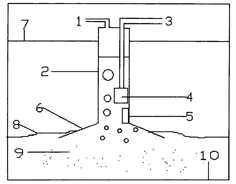 本发明公开了一种海底天然气水合物开采装置及其开采方法,其特点是该装置由空心刚体(2)直接与海底(10)的天然气水合物层(9)连通;或者空心刚体通过泥沙层(8)或不渗透层(11)与海底(10)的天然气水合物层连通;空心刚体内的一侧设有水泵(4)和测试监控装置(5),水泵通过导管与海平面(7)上的排水管口(3)连接,测试监控装置与摄像系统和测压系统连接,空心刚体内的上端设气体收集管口(1)。开采方法包括以下步骤:1)在海上建一个与海水分离的空心刚体,空心刚体与海底天然天水合物层连通;2)通过水泵向空心刚体外排水降低空心刚体内的水面高度,使天然天水合物层所受的压力减小,当天然气水合物层受到的压力小于其平衡压力时,天然气水合物就开始分解成天然气和水;3)分解后的天然气上逸,从气体收集管口排出、收集。
