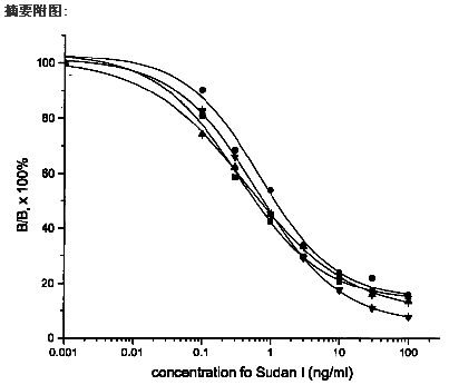 本发明公开了测定食品中苏丹红1号含量的酶联免疫吸附分析方法(ELISA),其特点是合成了两种不同碳桥长度的苏丹红衍生物,并将衍生物与载体蛋白质交联,获得四种多克隆抗体。有8种测试组合,7种组合可用于对苏丹红1号的免疫分析,标准曲线的浓度范围为0.1~100ng/mL,IC50为0.3~2.0ng/mL。四种抗体与苏丹红2-4号的交叉反应率为0.1~14.3%,与6种食品可添加色素几乎没有交叉反应,说明抗体对苏丹红1号有很高的特异性。6种市售食品用作加标样品。经简单的样品处理后,萃取液直接稀释,用于ELISA测定。苏丹红1号的加标回收率92.4~114%,相对标准偏差为5.9~24.8%。用HPLC对加标样品进行分析,并与ELISA结果对比。两种方法有较高的相关性(R=0.9851;n=7)。