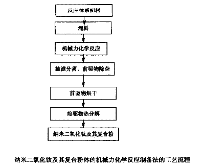 本发明公开了一种纳米二氧化钛及其复合粉体的机械力化学反应法,涉及一种可用于化妆品、涂料等领域的纳米二氧化钛及其复合粉体的制备技术,其特征在于利用球磨过程中产生的剪切力、冲击力破碎固相反应体系,增加反应物的比表面积,提高反应速率,从而提高成核速率和长大速率的比值,制备出微细、均匀的前驱物,然后洗涤、干燥、控制热分解温度与时间,从而可获得不同晶型、不同粒径的纳米二氧化钛及其复合粉体,同时实现纳米二氧化钛的表面包覆。此种方法不仅简化了工艺,而且所制备的纳米二氧化钛晶型、形貌、粒径可控;通过调整反应体系及其配比,可在制备纳米二氧化钛的同时,在其表面生成纳米氧化锌、纳米三氧化二铝等无机物粉体,即在制备纳米二氧化钛的同时实现表面包覆。粉末粒径分布为30-80nm。