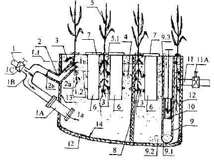 人工湿地生活污水处理方法及系统。属污水和泥渣的处理类。解决现有人工湿地生物膜堵塞、寿命短的问题。开挖池体,其内填充砂土和种植植物,池体下方装进水单向阀,污水从此进入池体并向上渗透,使植物根系、砂土和污水形成含生物膜的砂洲生态系统,通过生物膜将污水净化。生物膜形成的硬壳用L型管自动浇灌、软化、下沉和污水的浮渣一同通过竖直排渣管和其内的排渣单向阀,用机械或人工产生气压差将渣方便的吸出。同时利用L型水管的溢流作用,自动开闭进水单向阀。L型水管也可方便为农民提供浇灌农田的粪水。为防止含生物膜的砂洲生态系统内产生浓沼气引发爆炸,在该处设竖井和活动盖,人可以进去检测,保证安全运行。适合生活污水的处理。
