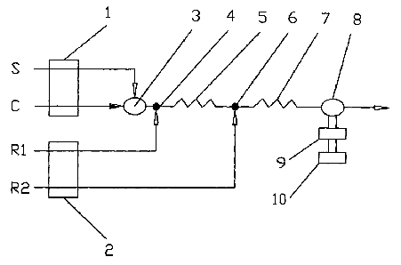 一种水样中苯胺的自动分析方法,推动液C为去离子水或蒸馏水,反应液R1为亚硝酸钠-H2SO4水溶液,显色液R2为甲萘酚-NaOH水溶液;反应液R1经反应液流路进入分析检测流路,推动液C经推动液流路、进样阀进入分析检测流路,显色液R2经显色液流路进入分析检测流路,在分析检测流路中,反应液R1与推动液C和显色液R2混合后进入光学流通池,产生基线被测绘;标样或试样S经样品流路进入分析检测流路,在推动液C的推动下与进入分析检测流路的反应液R1混合并发生重氮化反应,然后与进入分析检测流路的显色液R2混合并发生反应生成有色物质,上述含有色物质的混合液进入光学流通池,产生谱图被测绘。