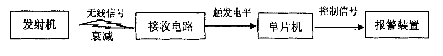防物品丢失或人员走失报警提示器包括主机和子机。主机是接收机,子机是发射机。主机由收发电路,控制电路和报警提示装置三个部分构成。主机的控制电路是单片机,其中预先设置有监控距离门限值和时间门限值。监控距离门限值与强度值对应。子机的发射装置是与主机的收发电路相匹配的微功耗RF芯片。报警提示装置采用蜂鸣器。本提示器通过接收信号强度的门限值来控制丢失、走失范围,并自动发出报警,效果好且使用简单方便。电路可靠功耗小,装置电源采用体积小巧的纽扣电池,产品体积非常小,便于携带,适用性强,使用范围广。成本非常低,具有较高的商业价值。