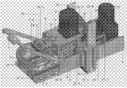同步带驱动的自适应误差消除式自动取物装置有三层安装板,板层间设置有滑杆,通过滑杆的支架和套装其上的滑块将本装置连为一体。板上设置下料同步带驱动装置、伸缩装置、翻转出料和自动回缩装置。下料装置在三层板上,自动回缩、翻转出料在二层板上。伸缩装置的伸缩电机13、主动轮30、从动轮31和伸缩同步带28安装在底板9上,同步带夹片29在二层的背面并与伸缩同步带28连接。旋转及伸缩套筒6安装在第二层板上,具有翻转和伸缩两种功能。下料同步带4与被取物的瓶盖的齿条啮合。加装有定位弹簧和前、后位限位传感器,自适应消除误差。底板上安装的垂直提升架可使本装置沿Y轴上下运动。