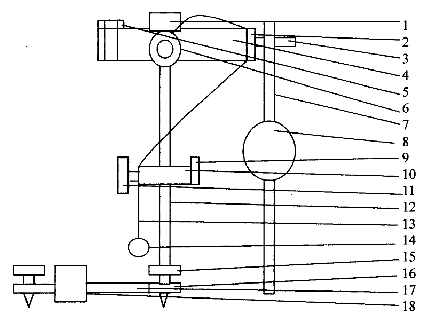 一种单摆复摆合成实验仪,主要由T形座、立柱、角度板、上座、三角刀口、压线板、U形刀承、绕线盘、单摆线、单摆小球、摆杆和摆锤等组成。立柱固定在T形座上,角度板固定在立柱中部,上座安装在立柱顶端,绕线盘安装在上座左侧面或者右侧面,三角刀口、压线板安装在上座前端面,压线板套在三角刀口上并由螺钉紧固在上座上,U形刀承安装在上座后方,复摆摆杆和摆锤在不用时就放在U形刀承上。做单摆实验时,取下三角刀口,松开压线板,量好单摆线长度,用压线板压紧单摆线即可实验,实验结束后将单摆线和单摆小球绕挂在立柱中部的角度板紧固螺钉上,这就不影响复摆实验的进行了。做复摆实验时,装上三角刀口和摆杆摆锤即可,实验结束后将摆杆(摆锤)悬挂于上座后方的U形刀承上,这就不会妨碍单摆实验的进行了。单摆复摆合成实验仪的有效果是,在一套实验装置上实现了单摆和复摆两种实验,使仪器占用空间减半,仪器费用减半,仪器使用效率倍增,同时可使学生进一步理解单摆、复摆两种实验原理的联系。