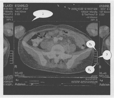本发明公开了一种CT胶片扫描图像中断层图像的分割方法,包括以下步骤:1)确定参考断层图像的分辨率;2)用矩形框在参考断层图像上,选定需要分割的断层图像;3)将参考断层图像上标尺端点作为参考点,锁定矩形框与标尺参考点的相对位置关系;4)确定其他断层图像的分辨率,除以参考断层图像的分辨率,得到缩放比例,根据缩放比例对其他断层图像进行缩放;5)以其他断层图像上标尺端点为参考,确定矩形框在其他断层图像中的位置,矩形框包围的区域即为需要分割的断层图像。本发明以标尺的端点为参考点与矩形框关联起来,实现断层图像的快速定位,保证了分割出来的一幅幅断层图像在比例和方向上具有很好的一致性。