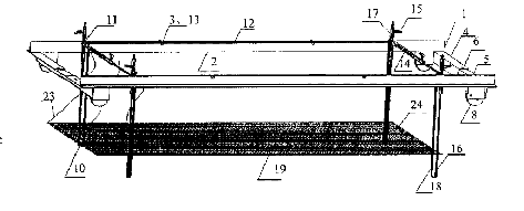 一种室内水槽沙卵石推移质全断面采样装置,其特征在于该装置包括轨道车、采沙固定架和采沙网,轨道车由纵梁和横梁连接的矩形框构成,框底沿纵梁设置有与室内水槽导轨相匹配的轨道连接件;采沙固定架由连接框、锚定杆和采沙网固定杆组成,活动连接于轨道车的矩形框内,锚定杆和采沙网固定杆一一配对并使其下端连为一体,且通过锚定杆的上杆部固定于连接框四角;采沙网通过其上的套圈套接落于采沙网固定杆底部。该装置结构简单,重量轻,调节方便,使用灵活,可对不同尺度水槽的任意全断面运动的推移质进行采样,且置入水槽平稳,不会影响局部区域泥沙运动的原有特征,采样准确,填补了室内水槽推移质全断面采样装置的空白。