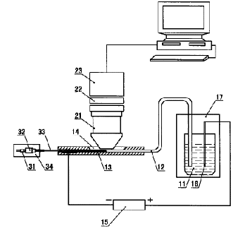 本实用新型公开了一种高效毛细管电泳仪。它由毛细管电泳装置、荧光检测器和光源系统构成,所述毛细管电泳装置包括有毛细管(12),所述光源系统包括有激发光源(31)。所述光源系统还包括有从毛细管(12)的检测端口伸入至检测窗口(14)部位的光导纤维(33),激发光源(31)所产生的激发光由该光导纤维(33)引入至其内端,照射在检测窗口(14)实现待测物质荧光激发。本实用新型的有益效果是,具有检测灵敏度高、成本低廉、背景噪音低、可选波长范围较宽、结构和操作简单的特点,为生物、医学和化学等学科提供一种经济的检测手段,适合微量和痕量物质检测,特别适合于生物样品中氨基酸、蛋白质等的检测。