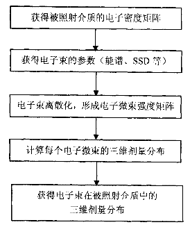 本发明公开了一种确定电子束剂量分布的方法,包含以下步骤:a)采用计算机断层扫描测量得出被照射物体的电子密度矩阵;b)测量记录照射电子束的初始侧向参数、电子束能谱和源皮距;c)将照射电子束离散为电子微束矩阵,并利用混合笔束模型计算得出每个微束在被照射物体中的三维剂量分布;e)将每一个电子微束的剂量矩阵相加,获得电子束在被照射介质中的三维剂量分布矩阵。依照本发明测量电子束在人体或类人体介质中的三维剂量分布,需要测量数据少、计算速度快、计算精度高。