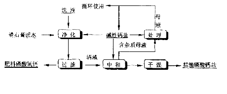 一种利用磷石膏回水及其洗液制备精细磷酸钙盐的技术,该技术的应用领域属于磷酸盐的生产行业。其特点是可以改变目前由于磷矿品位下降、磷矿中的杂质过高和企业对磷酸萃取条件控制不当所造成的磷酸浓度下降和磷石膏中的水溶磷、水溶氟上升的状况,也可以把目前湿法磷酸生产企业的磷酸(P2O5)浓度从22~26%提高到28~32%,而磷石膏中的水溶性P2O5降到0.3%以下,可溶氟离子下降到0.02%。磷石膏回水及其洗液中含有大量的杂质,需要利用碱性钙盐净化,净化后的料浆经过过滤,滤饼为含杂质较高的肥料级磷酸氢钙;根据净化程度不同,清液可以用来进一步生产不同类型的精细磷酸钙盐,反应结束后过滤,滤饼经过干燥得到产品。