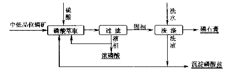 一种利用中低品位磷矿制备高浓度磷酸的方法,其特点是在现有磷酸萃取装置的基础上,利用硫酸直接分解中低品位磷矿,分解中低品位磷矿后的料浆溶液,经过分离,采用一定量的洗水充分洗涤固体磷石膏,使磷石膏中的水溶磷达到与使用优质磷矿产生磷石膏中的水溶磷一样的水平(0.3%),同时可以生产高浓度磷酸。其具体方法是:在生产高浓度磷酸过程中,把增大磷石膏的洗水量分离出萃取磷酸系统,这部分洗液用来生产沉淀磷酸盐,避免水量增大对原有系统产生的不利影响,在此过程中部分磷元素被用来生产精细沉淀磷酸盐,从而可以使磷的损失达到最低,生产沉淀精细磷酸盐的母液被循环到磨矿系统或作为磷石膏的洗水加以循环利用。