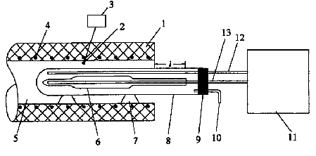 一种晶体生长的石英坩埚镀碳膜方法,工艺步骤为石英坩埚的处理、装炉、加热、镀膜、膜层退火。石英坩埚的处理包括清洗与烘干,装炉是将清洗并烘干后的石英坩埚与组成镀膜装置的部件进行组装,加热是将装有石英坩埚的沉淀室加热至1000℃~1060℃,然后在该温度保温并向石英坩埚和沉淀室内通高纯惰性气体排除残余空气,镀膜是通惰性气体结束后,继续在1000℃~1060℃保温,并在此温度向石英坩埚内通甲烷气体,使石英坩埚内壁上沉积符合要求厚度的碳膜,镀膜结束后,继续在1000℃~1060℃保温40分钟~60分钟,然后缓慢冷却至室温。镀碳膜装置包括加热炉、放置被镀膜石英坩埚的沉淀室和供气控制器。