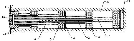 本发明公开了一种用于隧道围岩松动变形测量的套管式钻孔多点引伸计,能够准确的对多个不同深度的位移进行测量。包括引伸杆和空套在引伸杆上的至少一层引伸管,引伸杆和引伸管伸入测量孔的一端固定有粘固药包,各个粘固药包的轴向位置与测量孔内各个测点的位置相对应;引伸杆和引伸管的另一端延伸至测量孔的孔口,孔口处固定安装有测头,测头的周边与引伸杆间隔有距离,测头的外端部设置有与引伸杆的端部管壁的位置对应的插孔。将多个不同深度的位移监测集中到一个钻孔中进行,极大的简化了现场操作,具有环境适应性好、操作简单、测量精度高、成本低、一般人员稍经指导就可以进行操作的特点,尤其适合于在现有的隧道围岩松动变形测量中推广使用。