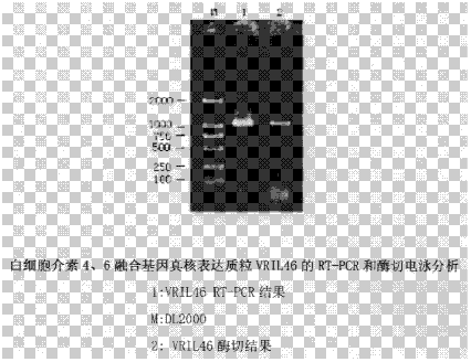 本发明融合猪白细胞介素-4、6基因,构建了融合猪白细胞介素-4、6基因真核表达质粒VRIL46,改组白细胞介素-2基因,构建了改组猪白细胞介素2基因真核表达质粒VRIL2-S,以分子量为150000、脱乙酰度95%以上的壳聚糖制备了壳聚糖纳米颗粒,提供了利用壳聚糖纳米颗粒对 VRIL46+VRIL2-S质粒组合进行分子包装制备纳米分子制剂的方法,公开了该纳米分子制剂作为新型抗感染分子免疫增强剂的应用技术。该方法包括壳聚糖纳米颗粒包装 VRIL46+VRIL2-S质粒组合,将此制备纳米分子制剂以肌肉注射方式协同疫苗免疫猪,增强猪特异细胞和体液免疫机能,提供了壳聚糖纳米颗粒包装VRIL46+VRIL2-S质粒组合作为新型复合猪白细胞介素基因抗感染纳米分子制剂的应用技术。