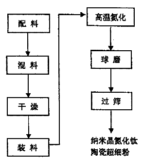 纳米晶氮化钛陶瓷超细粉的一种高温氮化反应制备法,以纳米氧化钛和纳米碳粉为原料,氮气为氮源,工艺步骤依次为配料、混料、干燥、装料、高温氮化、球磨、过筛。此法工艺简单,成本较低,较一般碳热氮化法节约能源,容易实现规模化工业生产。用此法制备的氮化钛粉末为球形,分散性较好,平均粒度大小为20~100nm,平均晶粒度大小为20~ 40nm,纯度达99%以上。
