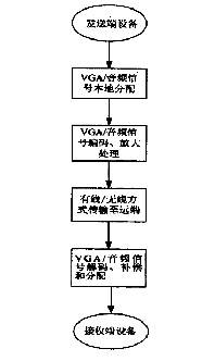 一种新的IPTV服务终端实现方法,通过一种有效的方式(有线或无线方式)将家用电脑与数字高清电视有机地互连成一个“整体”,家用电脑主要执行IPTV相关客户端软件,完成音视频流媒体信号的接收和解码等处理工作,数字高清电视主要完成音视频信号的显示和播放等功能,充分发挥二者的组合优势,从而有效地实现一种新的IPTV服务终端,可完成目前IPTV的各种服务,并可灵活地拓展实现未来各种新的服务。该方法为家用电脑与数字高清电视之间提供了一条双向“透明的”传输通道,既将电脑的VGA/音频等信号传输到远端的数字高清电视,又能在数字高清电视旁将各种电脑控制信号(包括USB、麦克风、PS/2和家用电脑开/关机信号)传输到远端的家用电脑。附图是本发明 VGA/音频信号传输方法示意图。
