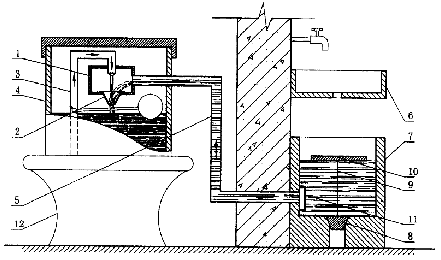 将厨房的废水收集起来用于冲马桶是一种很好的节水措施,然而要将这种想法变为现实却面临一个******的难题:在不借助电力、机械力或手动提升装置的情况下,如何让低水位厨房废水适时自动进入高水位的马桶水箱中。本发明提供一种厨房废水无耗能自动冲厕器,它由自动抽吸器、厨房废水池和废水管构成,在自动抽吸器中,高速喷射的自来水柱产生的负压,将厨房废水池中的废水适时自动抽入并与自来水一起进入马桶水箱中,它无须额外耗电、耗能,还实现了抽吸自动化。