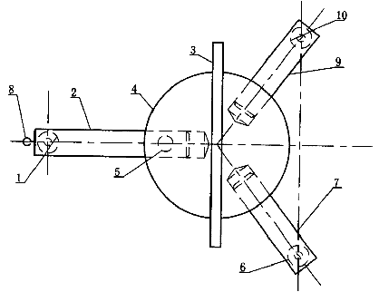 一种防摔式反射像易得光杠杆,通过在圆板基座开槽,并将光杠杆的三足分别沿圆板基座的半径自基座侧壁进入基座,并在后足端部设置套环,使光杠杆的后足既能方便地伸缩,又能实现自动自锁,还彻底消除了光杠杆翻落摔坏的危险。