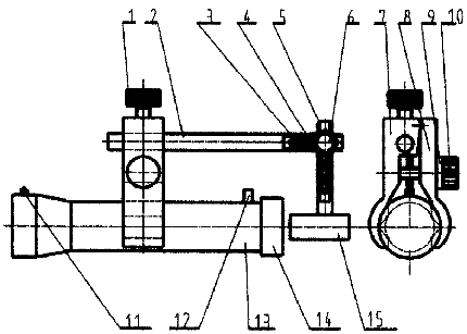 望远镜激光导向调焦装置,它主要由左连接爪、右连接爪、横杆、竖杆和半导体激光器等组成。所述半导体激光器放置在望远镜目镜前端,调节半导体激光器发出的激光束穿过望远镜射向远处的平面镜后反射到标尺上,再调节光斑在标尺上成一个小斑点,这就实现了望远镜激光导向和调焦功能。在可见的激光束引导下,望远镜光轴在对准平面镜、对准标尺(像)以及调节焦距等操作都变得很直观,调节起来非常容易。
