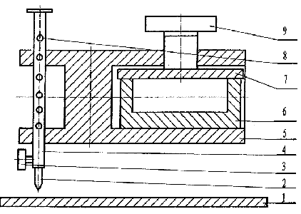一种精确定位线切割穿丝孔中心位置的装置,它是由安装在线切割机的上丝杆上的固定架、垫板、螺杆、弹簧、联结杆和中心锥等组成。利用线切割机本身的程控运动使中心锥停止在一个穿丝孔的中心位置,用鎯头或重物击打连接杆顶部,中心锥便在工件上打出中心坑,这就是该穿丝孔的中心位置,中心锥根据程序运动到下一个穿丝孔的中心位置停下,再打出中心坑。如此反复可以非常精确地定位每一个中心孔的位置。