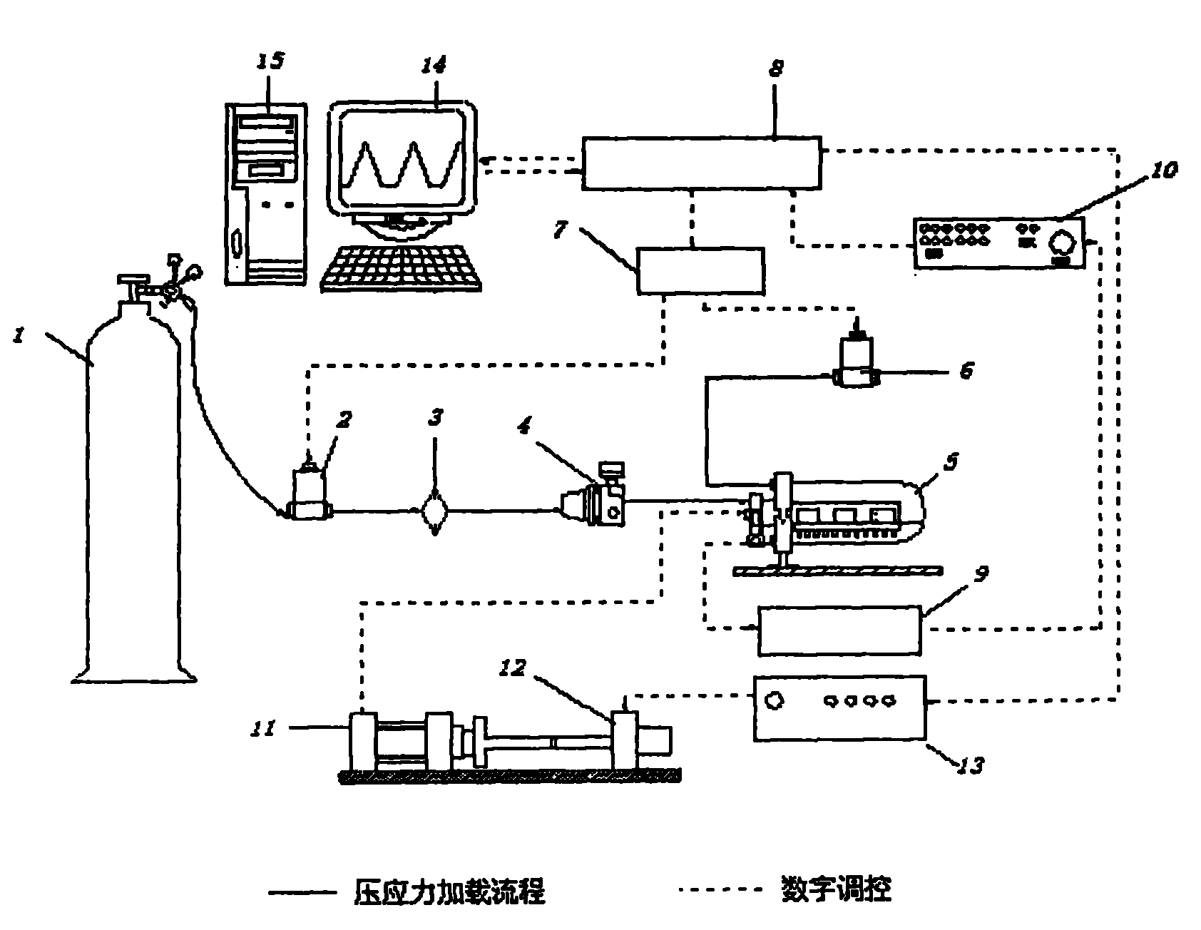 本发明公开了一种体外细胞压力加载装置及其体外细胞压力加载方法,其特点是该装置包括气压源(1)、进气电磁阀(2)、过滤器(3)、减压阀(4),压力腔体(5)和数字调控系统,气压源通过进气电磁阀、过滤器、减压阀与压力腔体连接;压力腔体(5)的一端与出气电磁阀(6)连接;出气电磁阀通过驱动电路(7)、多功能数据采集卡(8)与计算机(14)连接;驱动电路(7)另一侧与进气电磁阀(2)连接;压力腔体(5)的另一端与压力传感器(9)连接;压力传感器通过可程控增益放大器(10)、多功能数据采集卡(8)与计算机(14)连接;压力腔体(5)通过标准气缸(11)、直线步进电机(12)、功率放大器(13)、多功能数据采集卡(8)与计算机(14)连接。